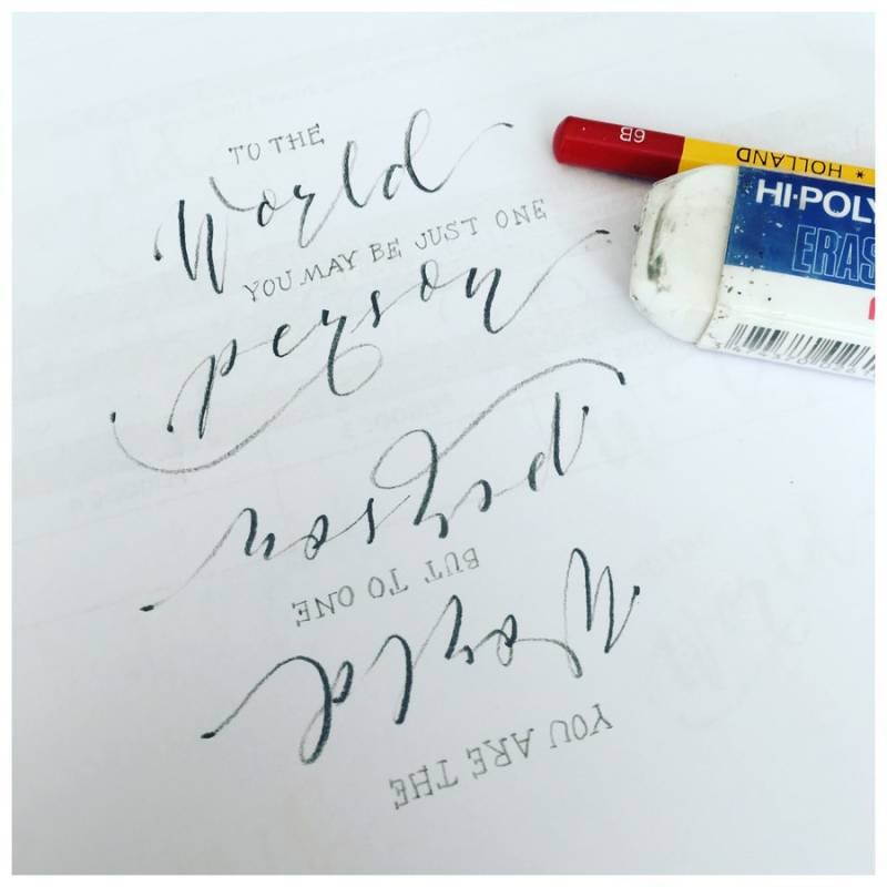 In de #dutchletteringchallenge waarover ik eerder vertelde, was de quote van vandaag 'to the world you may be just one person, but to one person you are the world'. Hoewel de volgorde niet meer te zien is, had ik bij mijn allereerste probeersel direct dat voor mij bekende gevoel van als iets kloppend is. Dus liet ik het zo