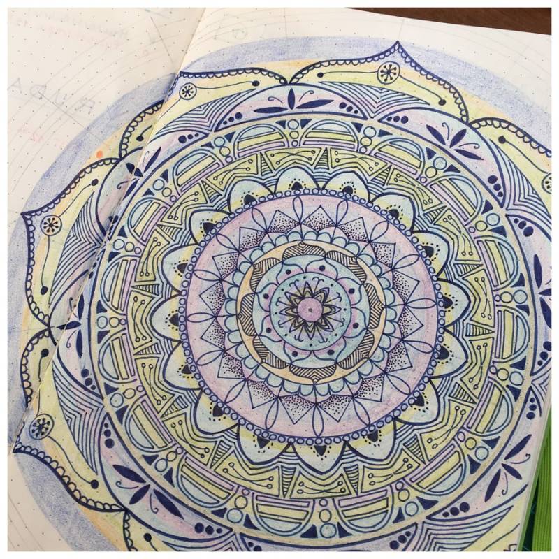 Ooit startte ik met mandala's kleuren. Daar had ik snel genoeg van. Ze zelf tekenen was leuk, maar niet lang. Nu maak ik een 'moodmandala': elke dag van de maand kleur ik een ring in met de kleur die staat voor de overwegende stemming van die dag. Na een paar ringen, teken ik er een stukje mandala overheen, tot de maand vol, en de mandala klaar is