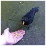 Ach wat leuk, mensen informeren naar merelmeneer. Hij komt nog steeds elke dag. Ik denk voor de gezelligheid. Hij eet drie, vier stukjes noot uit mijn hand en gaat dan een beetje tegen me aan zitten fluiten. We begrijpen elkaar wel