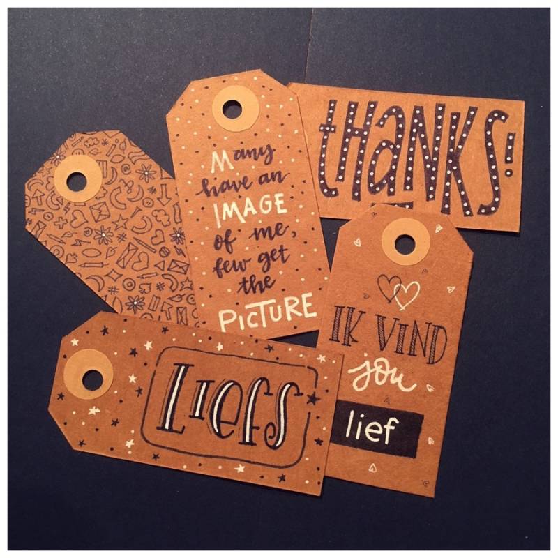 In mijn studiegroep van de opleiding PMKT zijn we aan het wichtelen: aan degene van wie je het lootje hebt getrokken, geef je ongezien tijdens een aantal lesdagen twee of meer cadeautjes, gebaren of iets liefs dat je doet. Een van mijn cadeautjes is een zakje met cadeaulabeltjes, die ik zelf maak. Heerlijk