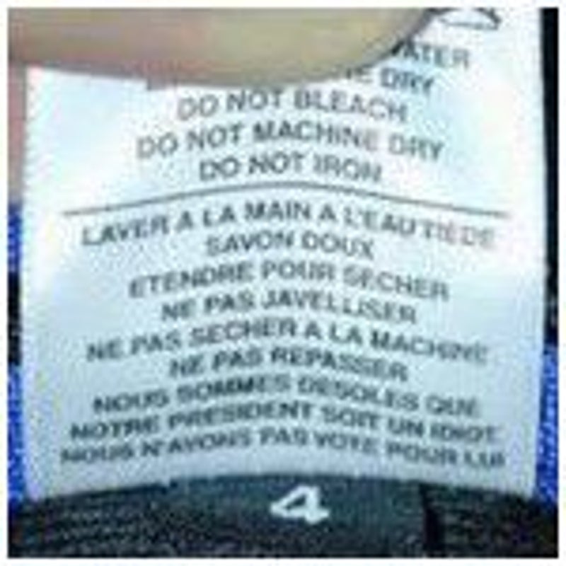 Oooh, dit zijn van die geniale dingen. Een Amerikaans bedrijfje, dat kleding levert aan Frankrijk, heeft op hun Franstalige labels staan (vertaald): "Was met warm water. Gebruik milde zeep. Liggend drogen. Gebruik geen bleekmiddel. Niet in de droogtrommel. Niet strijken. We vinden het erg dat onze president een idioot is. We hebben niet op hem gestemd."