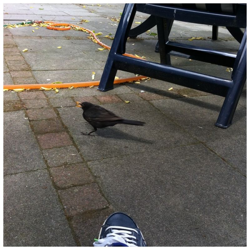 Hij komt elke dag, een beetje ongeduldig hippend op de stoep. Ik haal elke dag een nootje, dat ik in stukjes aan hem voer. Elke dag kijkt hij mij met zijnr kraaloogjes wat schuchter aan, terwijl hij steeds een stukje dichterbij durft te komen. We voeren mooie gesprekken
