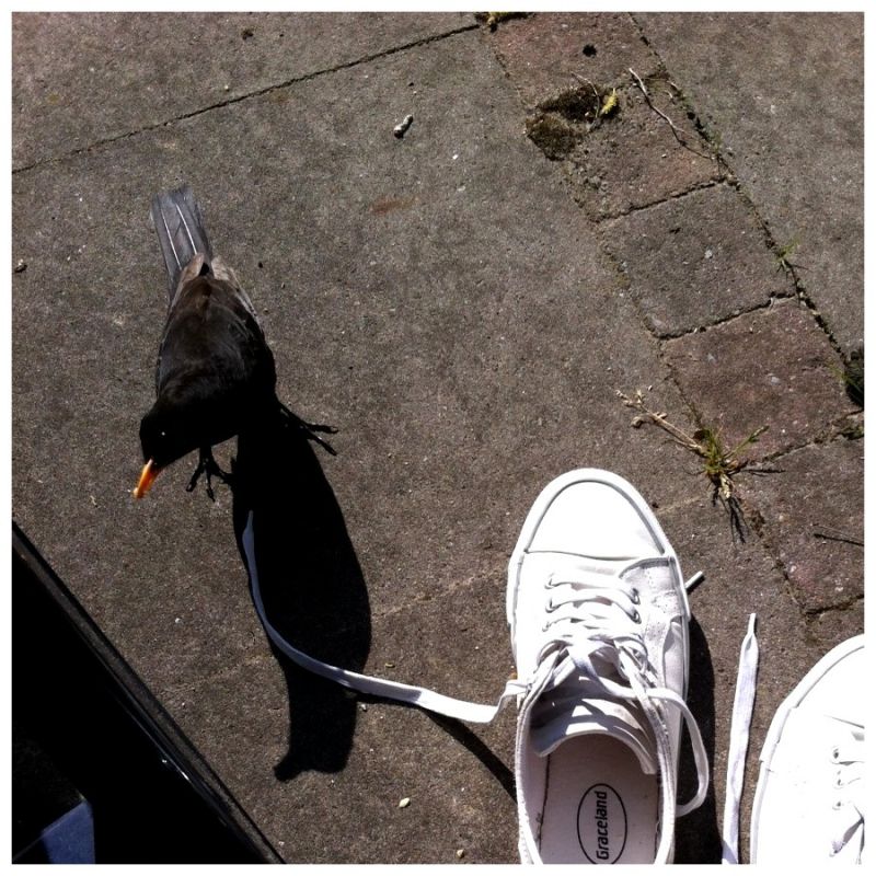 Ik zit even in de late middagzon, met wat nootjes. Het merelechtpaar komt onverschrokken naast en onder mijn stoel, de gestrooide stukjes noot oppikken. Opgewonden fluitend vliegen ze -volgens mij- richting nest, en zijn een minuutje later weer terug. Als het strooien te lang duurt, kijken ze me ongeduldig aan. Wat prachtig