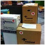Tevreden leveren we onze ingezamelde spullen in bij de vrijwilligers van het Rode Kruis